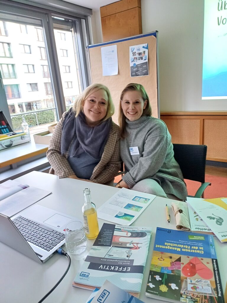 Zwei uns sehr regelmäßig unterstützende Junglehrkräftevertreterinnen, Pia-Alexa Kleiner und Annika Melchien, teilten kostbare „Überlebenstipps“ für den Vorbereitungsdienst. Neben den Anforderungen der Ausbildung wurden mögliche Reflexionspunkte von Unterrichtsbesuchen beleuchtet. Den wohl größten Punkt der Tagesordnung stellte das Classroom Management sowie ein bunter Strauß aus Empfehlungen zu Lehr- und Lernmaterialien dar. Melchien und Kleiner gaben daneben auch ihre eigenen Einschätzungen zu bestimmten Regeln und Ritualen sowie der Kommunikation im Lehrkräftezimmer ab. Zuletzt hatten die Teilnehmenden auch hier die Möglichkeit direkt Fragen zu stellen.