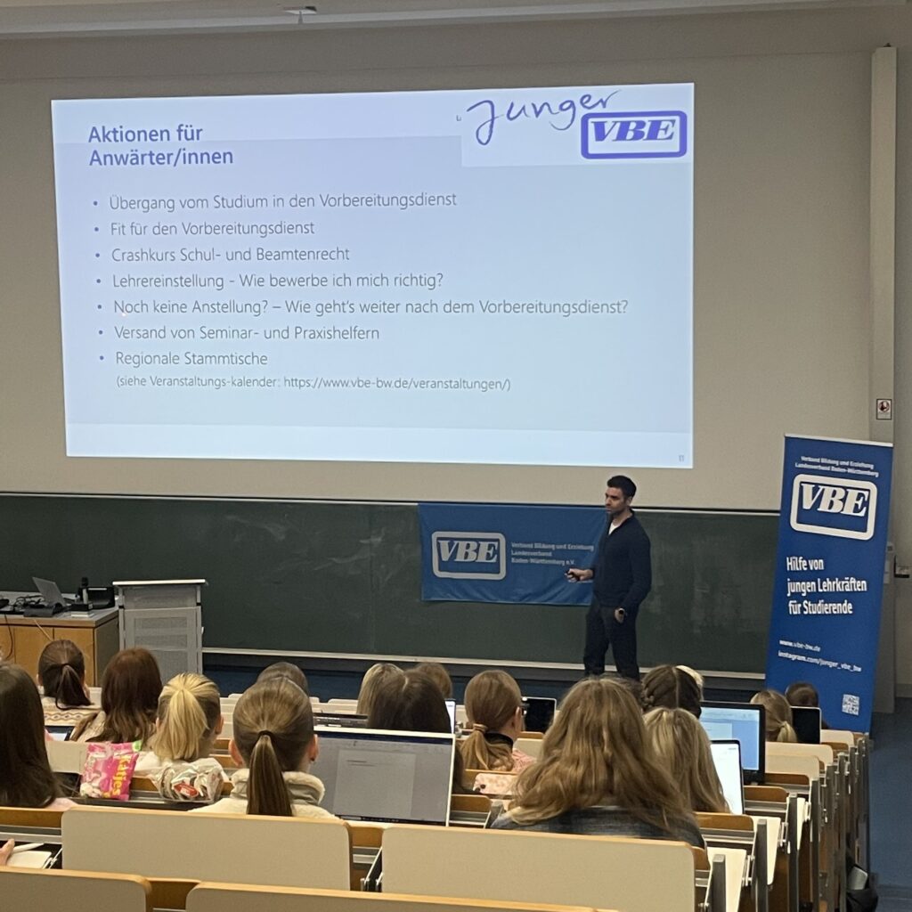 „Er ist wirklich toll, dass sich die Verbände in der Einführungswoche uns allen persönlich vorstellen. So konnte ich mir ein genaues Bild machen und hab‘ mich bewusst für den VBE entschieden!“, äußerte sich eine Lehramtsanwärterin nach dem Vortrag des VBE und füllte direkt eine Neuanmeldung aus.