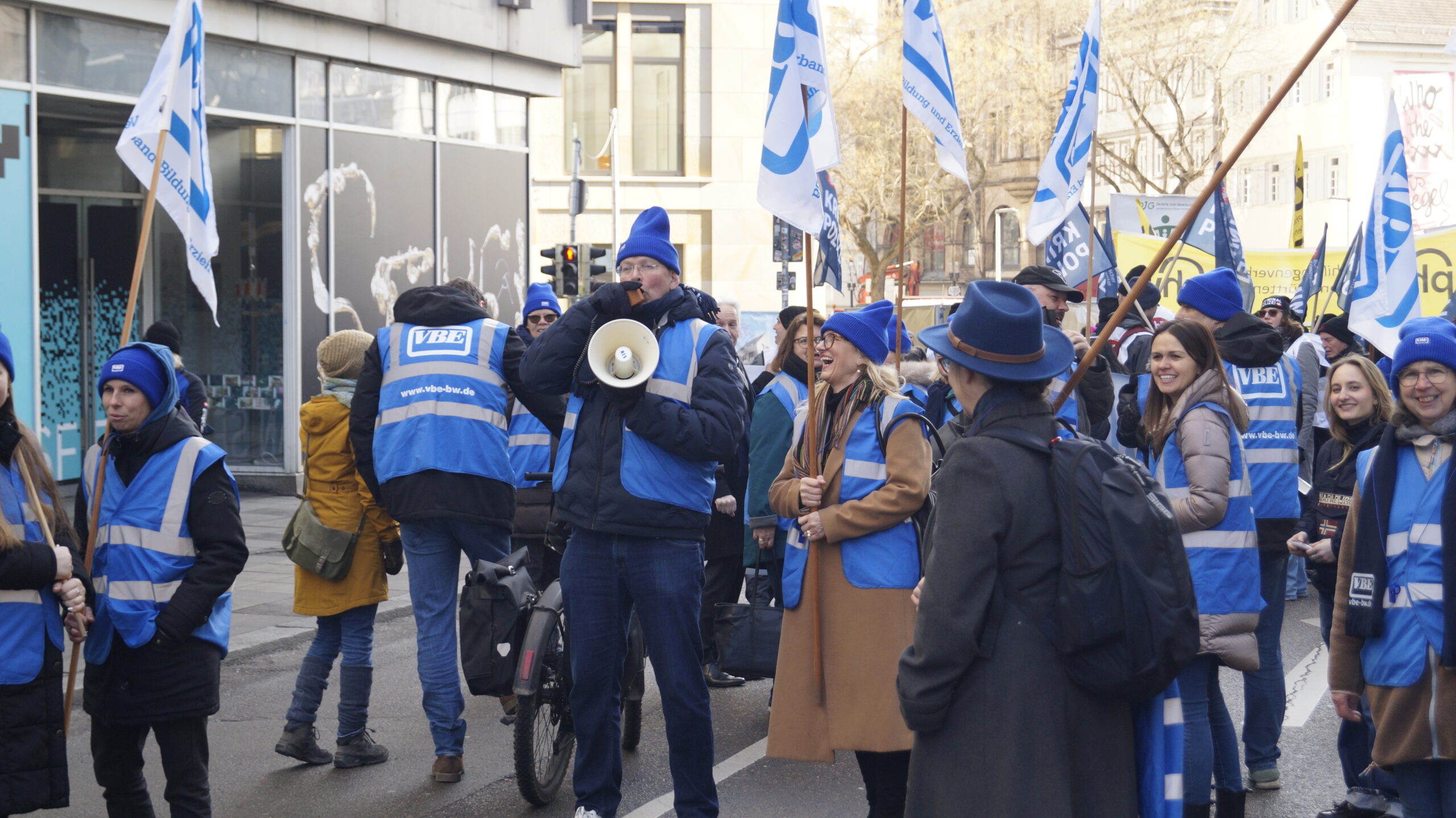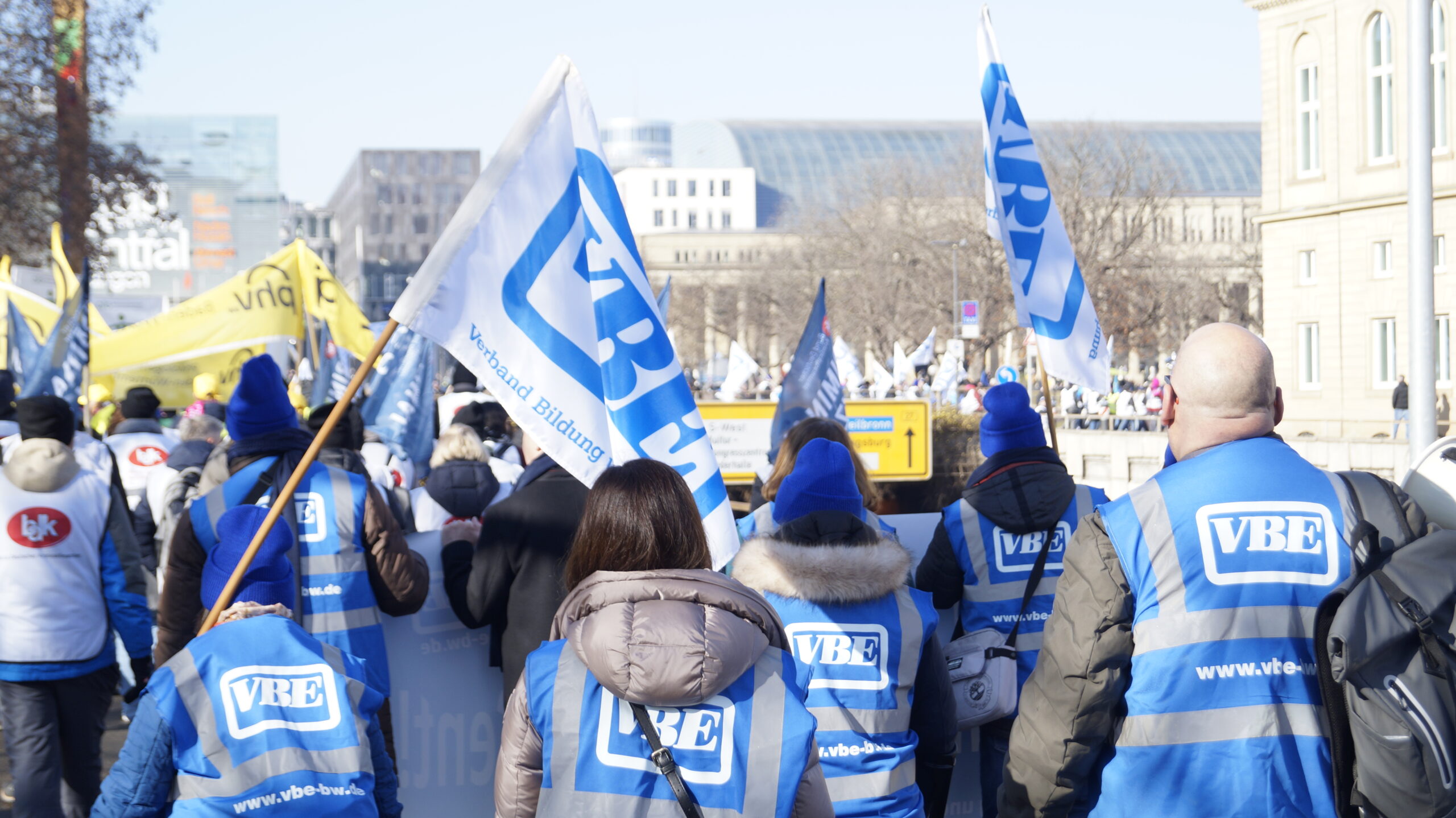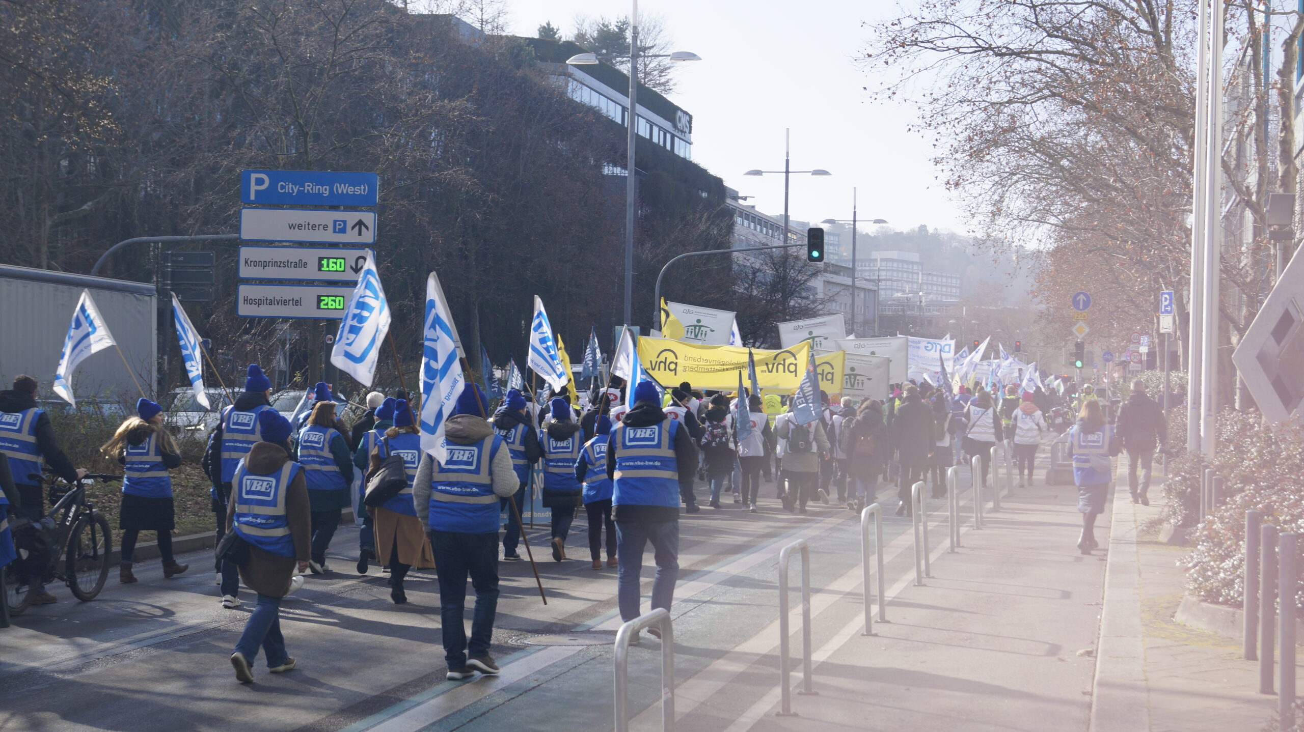 Am 5. Februar versammelten sich um 11 Uhr die Tarifbeschäftigten im öffentlichen Dienst der Länder in der Lautenschlagerstraße in Stuttgart. Sie trugen sich in die Listen ihrer Fachgewerkschaft ein, zogen Westen an, Mützen auf und bewaffneten sich mit Bannern, Fahnen und Trillerpfeifen. So ausgerüstet reihten auch wir uns, die Tarifbeschäftigten des VBE mit unseren Mitstreitern, in den langen Zug derer ein, die sich mit der Ignoranz der TdL nicht mehr abfinden wollen. Der dbb spricht von 4800 Teilnehmenden.