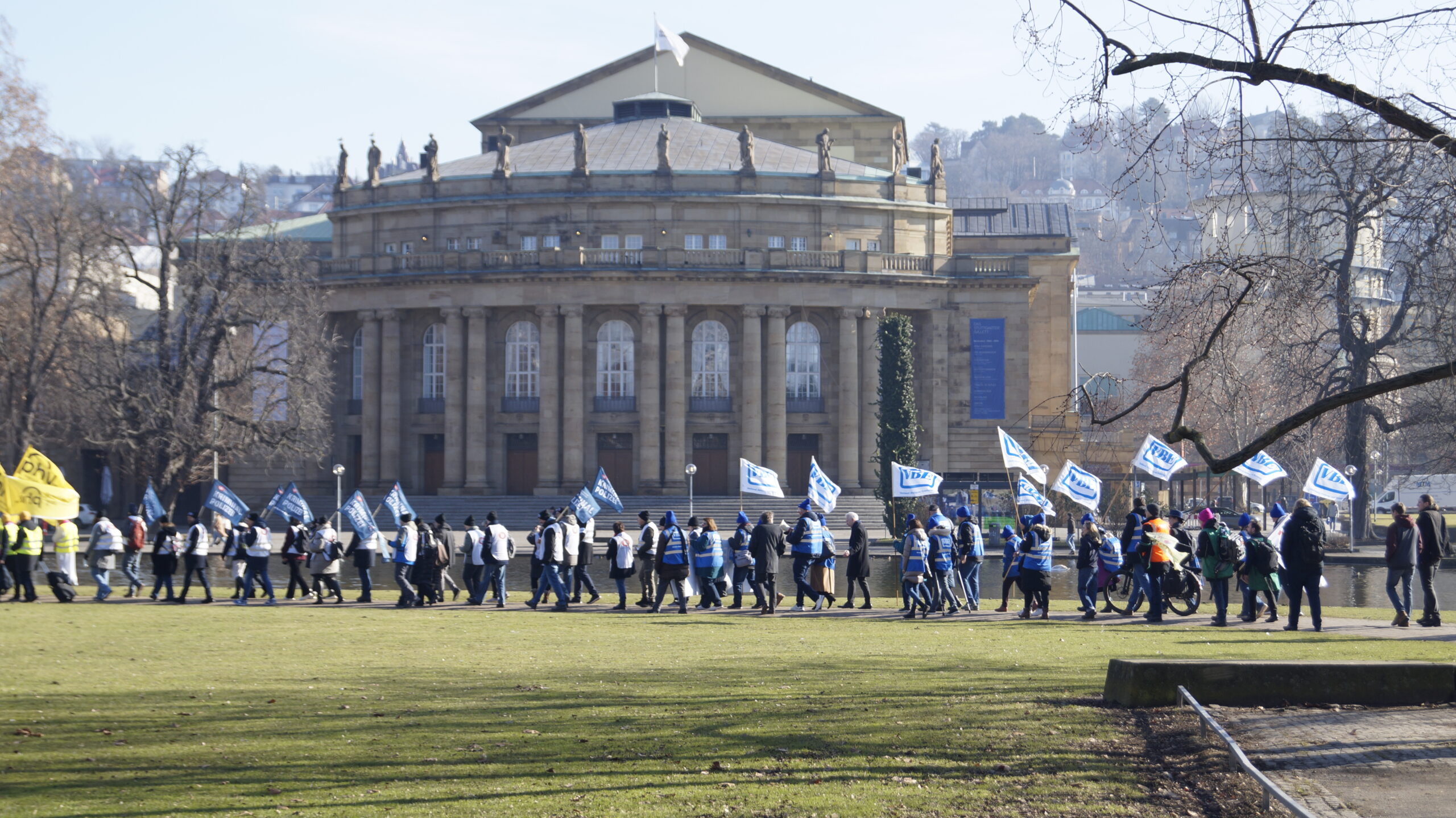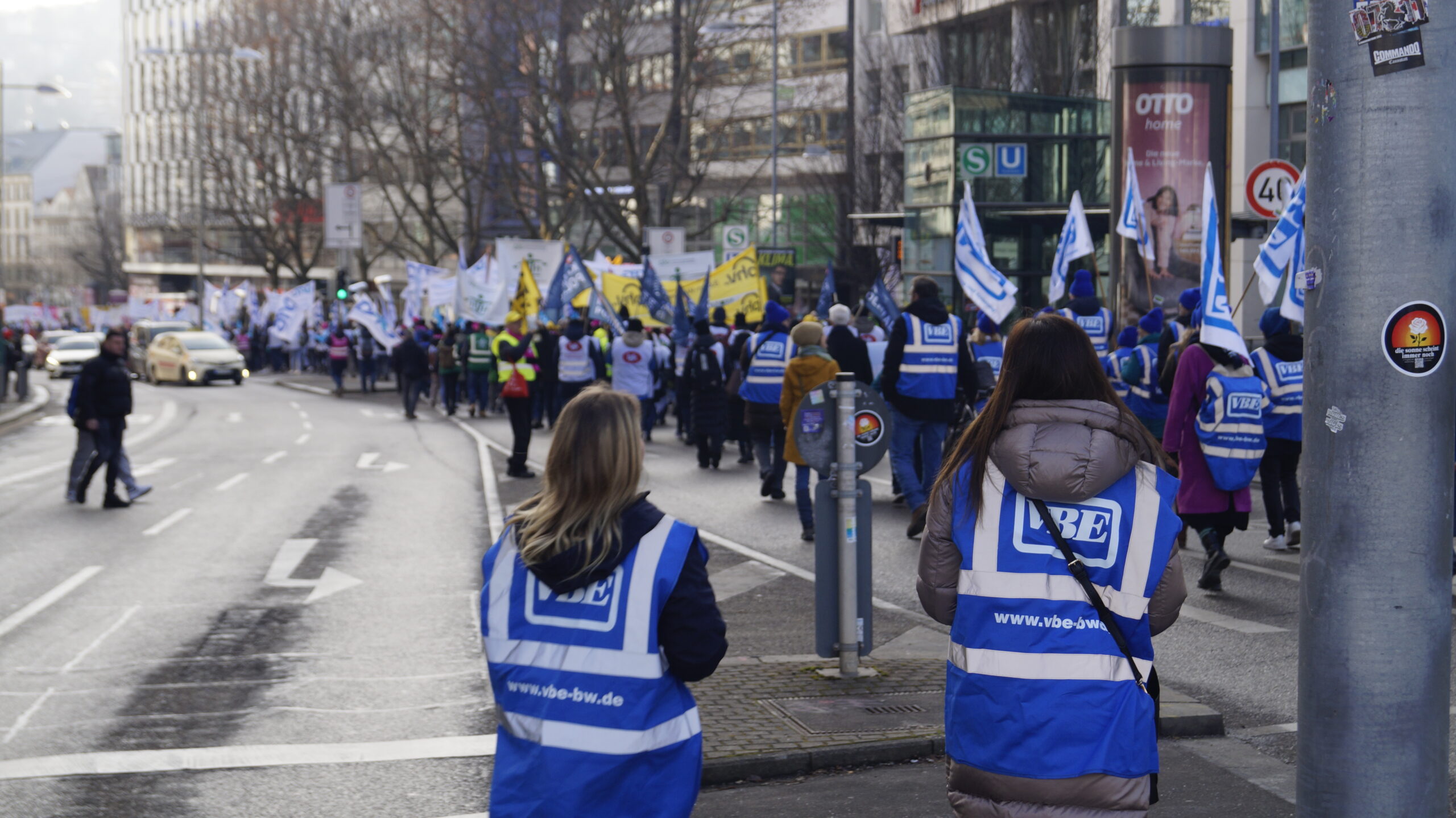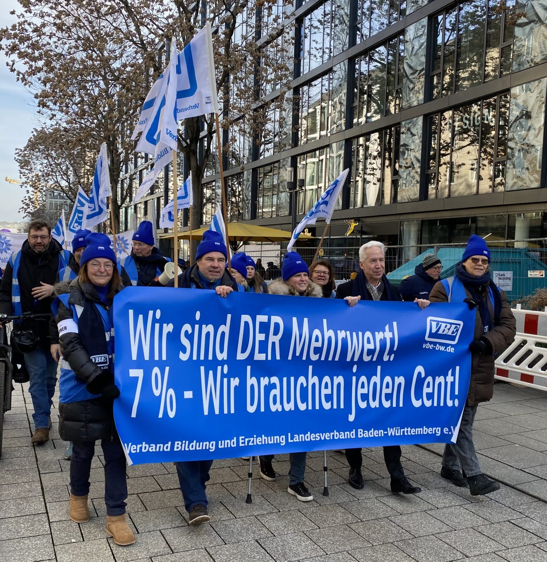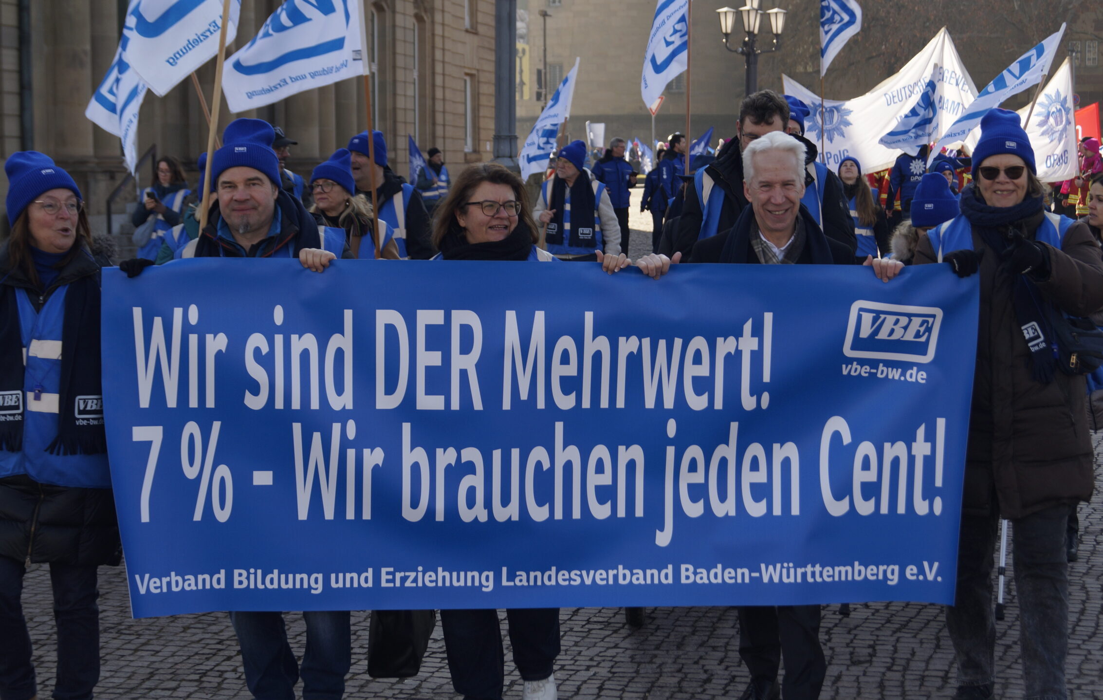 Am 5. Februar versammelten sich um 11 Uhr die Tarifbeschäftigten im öffentlichen Dienst der Länder in der Lautenschlagerstraße in Stuttgart. Sie trugen sich in die Listen ihrer Fachgewerkschaft ein, zogen Westen an, Mützen auf und bewaffneten sich mit Bannern, Fahnen und Trillerpfeifen. So ausgerüstet reihten auch wir uns, die Tarifbeschäftigten des VBE mit unseren Mitstreitern, in den langen Zug derer ein, die sich mit der Ignoranz der TdL nicht mehr abfinden wollen. Der dbb spricht von 4800 Teilnehmenden.