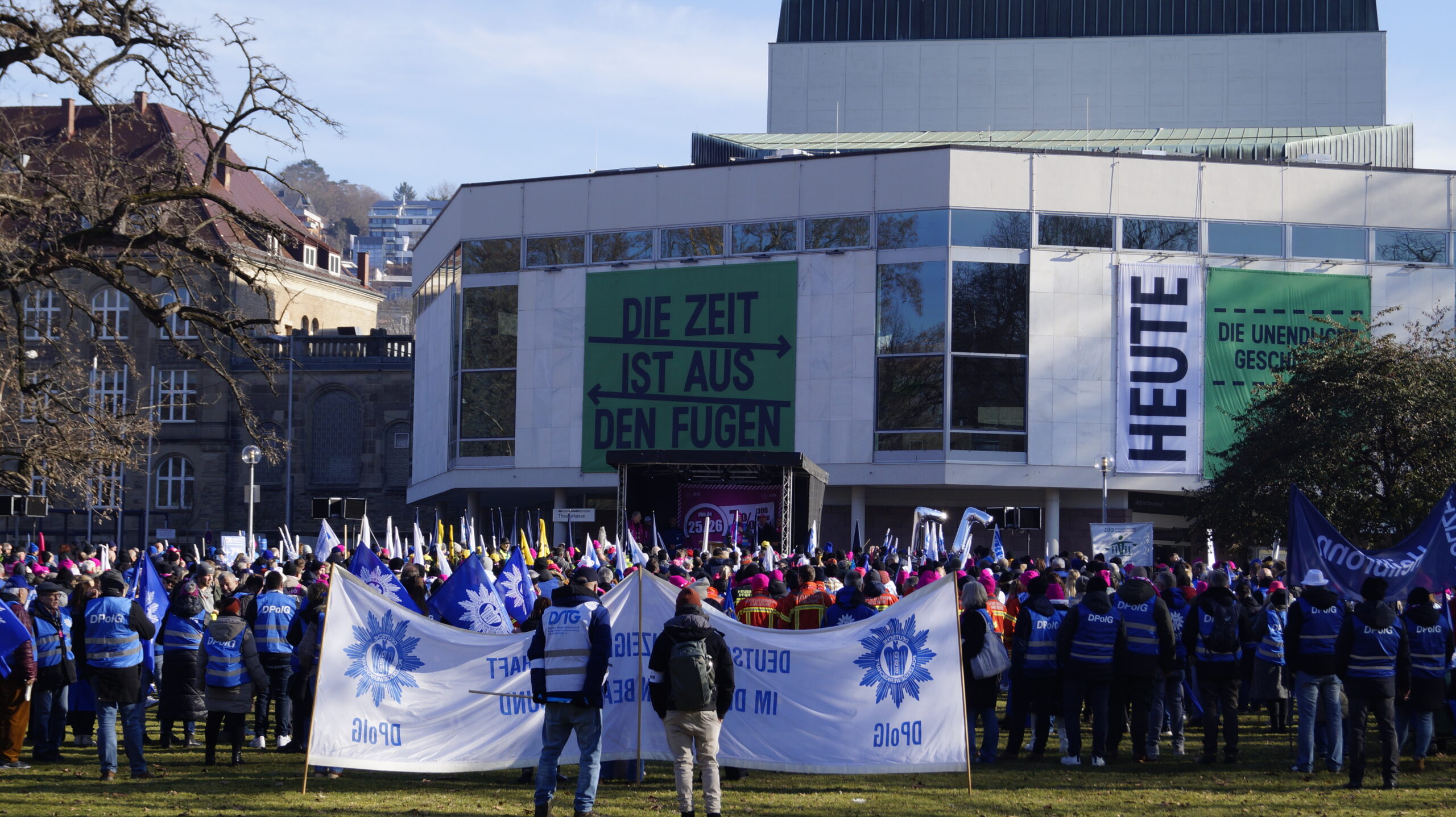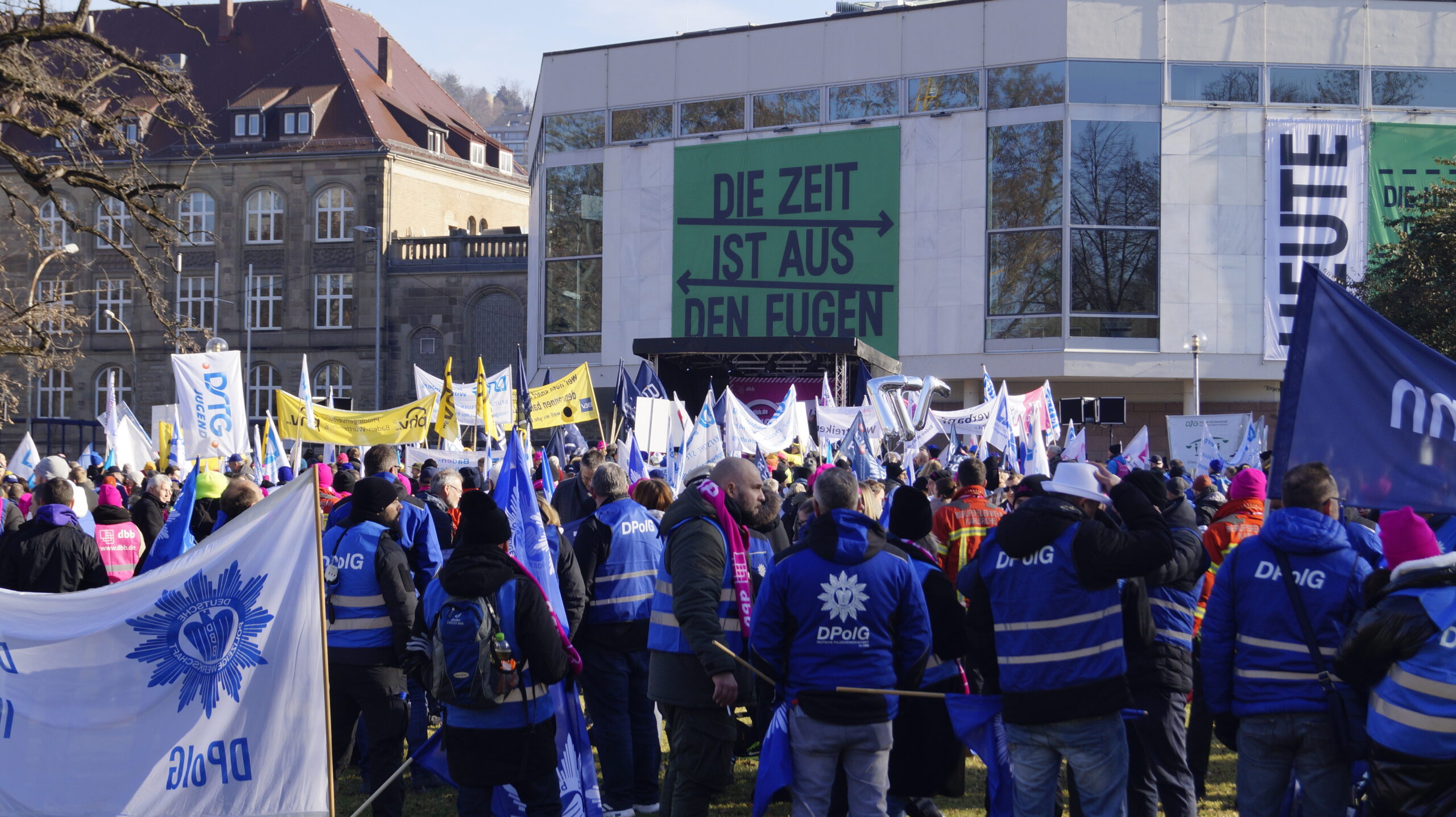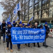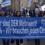 Um 11.45 Uhr setzte sich der Demonstrationszug in Bewegung. Die vielen verschiedenen Fachgewerkschaften, die dem dbb als Dachverband angehören, zogen friedlichen durch Stuttgarts Innenstadt. Am Schlossgarten, in Hörweite zum Finanzministerium, fand dann die Großkundgebung statt. Kai Rosenberger, Landesvorsitzender des BBW (Beamtenbund Baden-Württemberg), sein Stellvertreter Jörg Feuerbacher und vor allem Andreas Hemsing, der in seiner Funktion mit am Verhandlungstisch sitzt, machten noch einmal unmissverständlich deutlich, dass es unter diesen Bedingungen keinen Abschluss geben wird. Die Arbeitgeber müssen sich bewegen, ein verhandelbares Angebot auf den Tisch legen und damit auch ihre Wertschätzung für die Arbeit der Angestellten im öffentlichen Dienst der Länder beweisen.