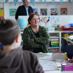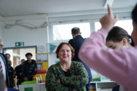 Natürlich durfte auch eine kurze Präsentation des in der Region einzigartigen „Haussystems“ mit schulinternen Wettweberben zur Stärkung der Schulgemeinschaft nicht fehlen, das Abteilungsleiter Fabian Schreiber zusammen mit den Lehrerinnen Franziska Muno und Miriam Gaymann mit einem Augenzwinkern in Richtung Hogwarts vorstellte. Unterstützt wurden sie dabei durch einige Schülerinnen und Schüler. Danach besuchte Ministerin Schopper die beiden internationalen Vorbereitungsklassen, in denen Kinder den Unterricht besuchen, die erst seit kurzem in Deutschland sind. Das Konzept erläuterte Konrektorin Sinja Grießer.