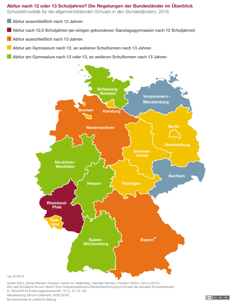 Bei genauerer Betrachtung der bundesdeutschen Bildungslandschaft wird aber schnell klar, dass dem nicht so ist. In der Tat gibt es die Möglichkeit eines G8 in fast allen Bundesländern, außer in Bayern und in Niedersachsen. Dort gibt es ausschließlich das G9. Die Wahlmöglichkeit zwischen G8 und G9 ist in den einzelnen Bundesländern unterschiedlich offen. In den meisten Bundesländern hingegen gibt es das G9 nicht unbedingt an den Gymnasien, sondern an anderen Schularten. (Siehe Schaubild.)