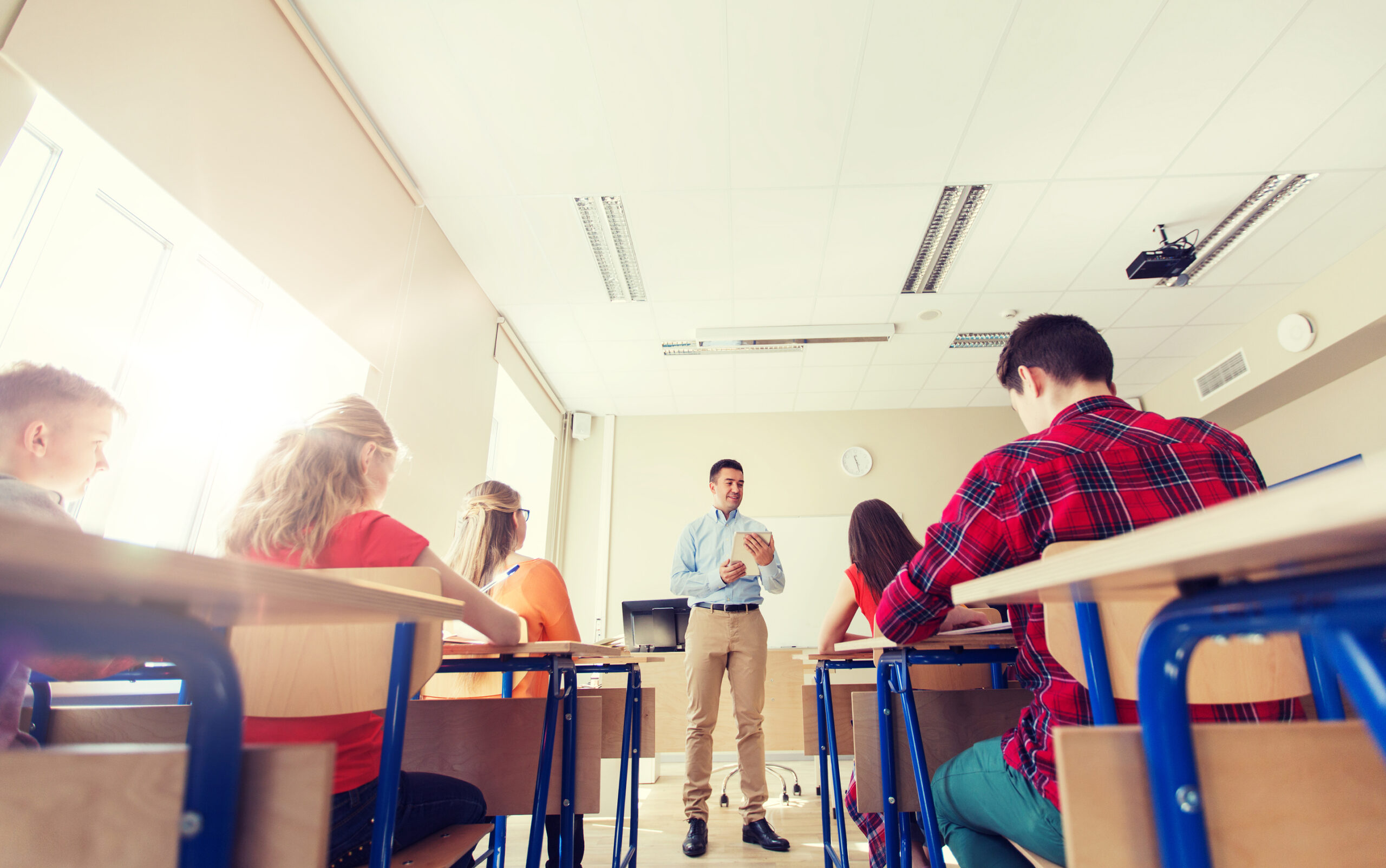 students and teacher with tablet pc at school