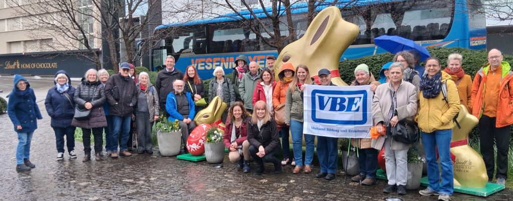 Viel Spaß hatten die Teilnehmer von „Ein Tag in Büsingen“, hier am Osteingang des Junkerhauses. Vorne neben dem VBE-Schild Nobert Hinz und Josef Klein, der Spiritus Rector der Veranstaltungsreihe „Ein Tag in…“